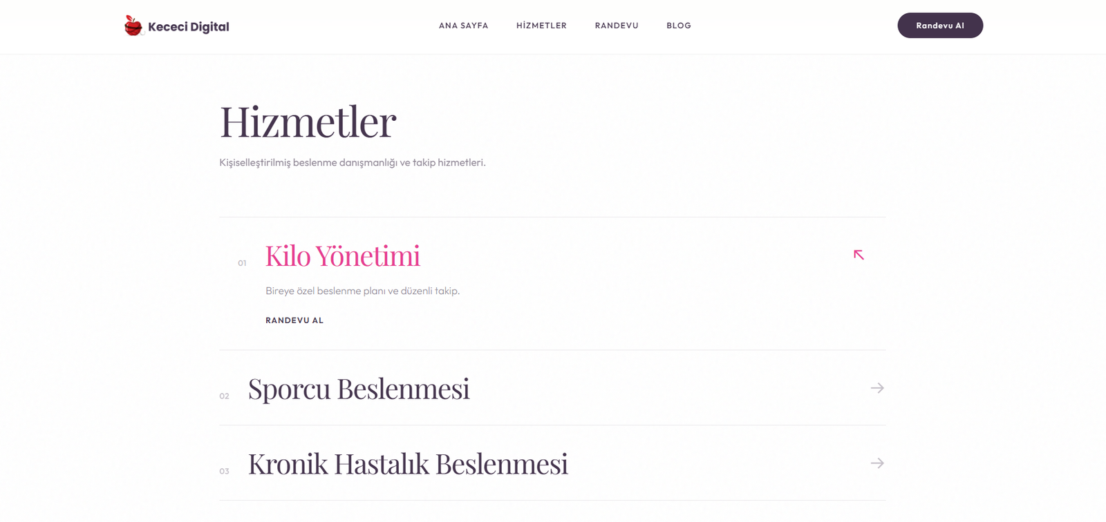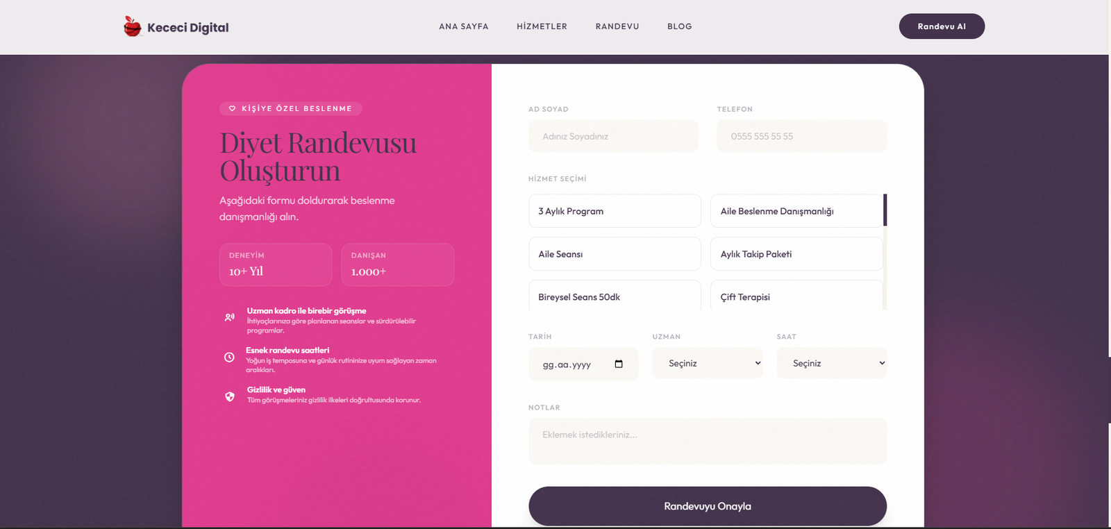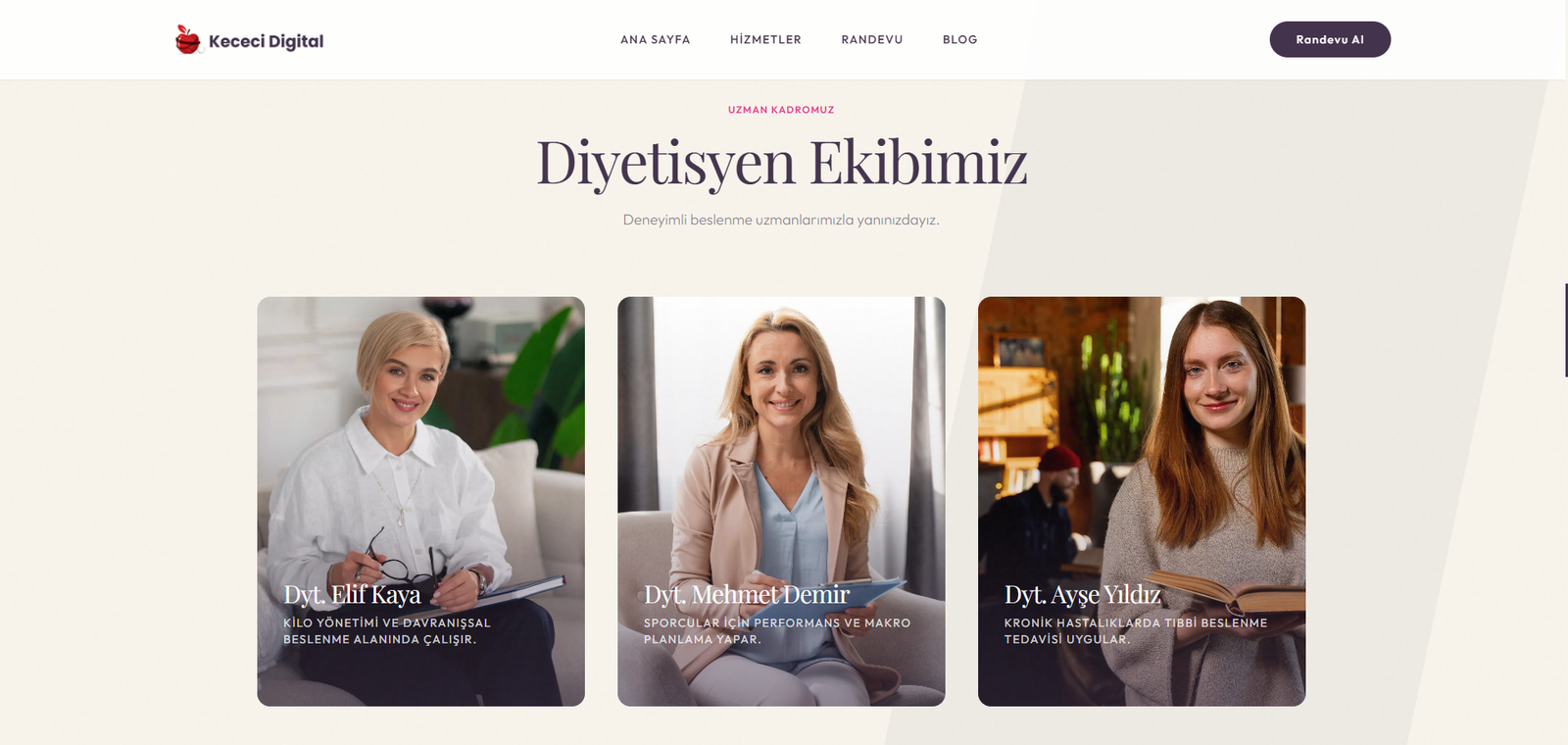 • Personel Yönetimi: Çoklu diyetisyen/personel desteği, personel bazlı hizmet ataması, çalışma saatleri yönetimi ve randevu dağılımı.