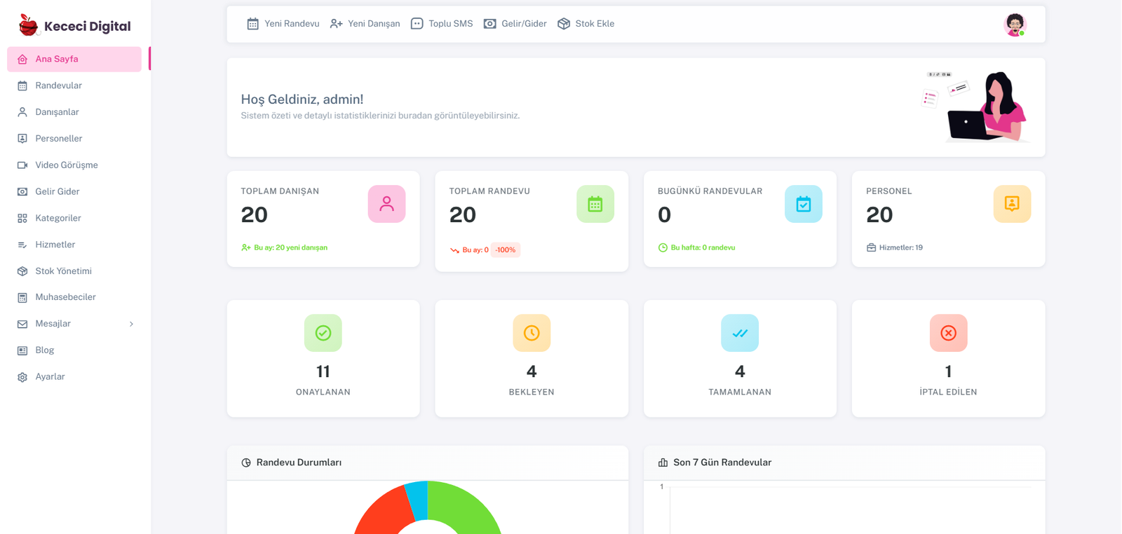 • Dashboard: Genel bakış – istatistikler, grafikler, bugünkü randevular, yaklaşan randevular, son eklenen danışanlar, en çok randevu alan danışanlar
