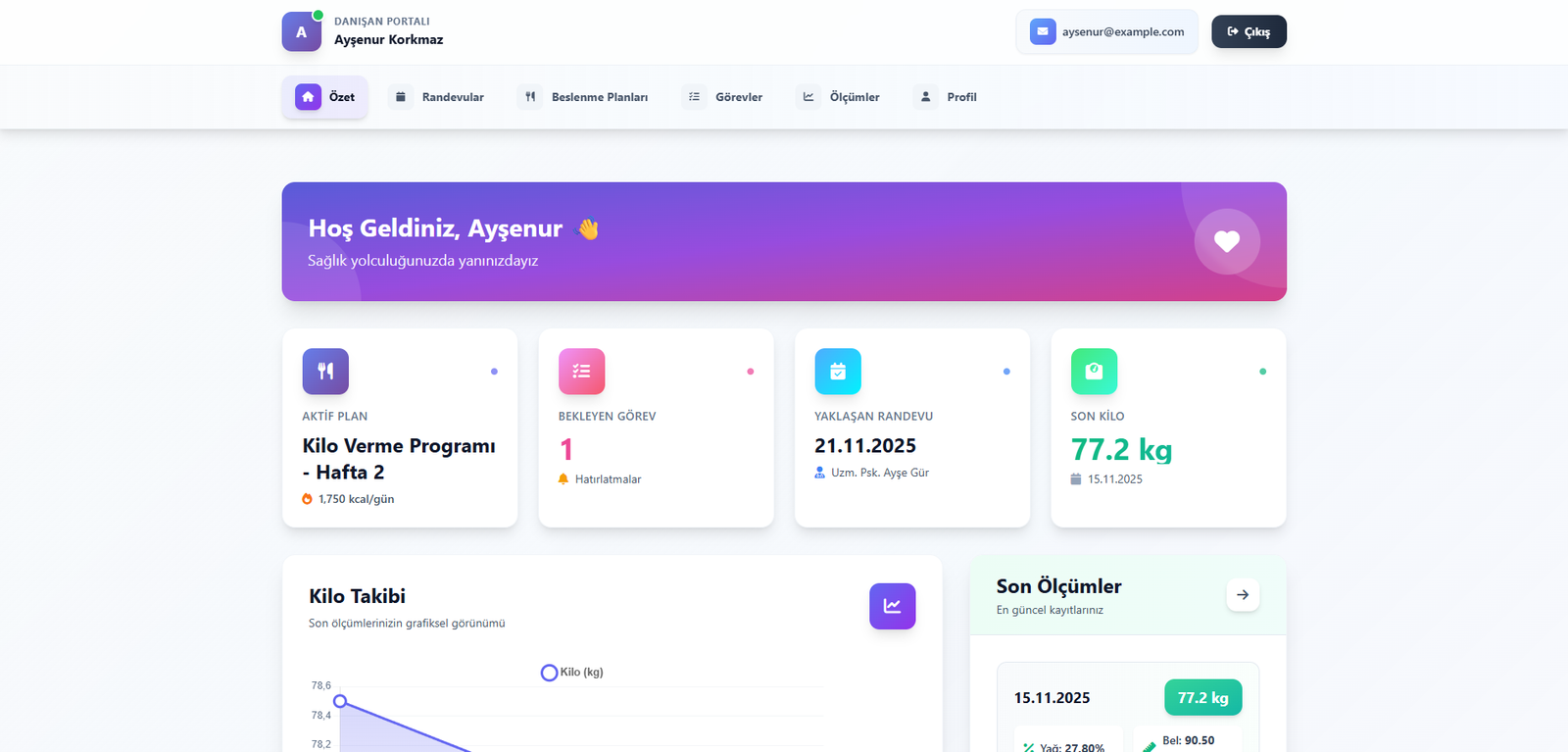 • Dashboard: Kişiselleştirilmiş özet sayfası, aktif beslenme planı, bekleyen görevler, yaklaşan randevular, son ölçümler, kilo takibi grafiği