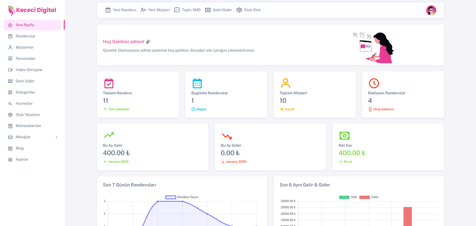 Modern güzellik salonları, kuaförler ve spa merkezleri için geliştirilmiş kapsamlı randevu yönetim ve otomasyon sistemi. Müşterilerinizden online randevu alın, personel ve hizmetlerinizi yönetin, finansal takibinizi yapın ve işletmenizi dijitalleştirin.
