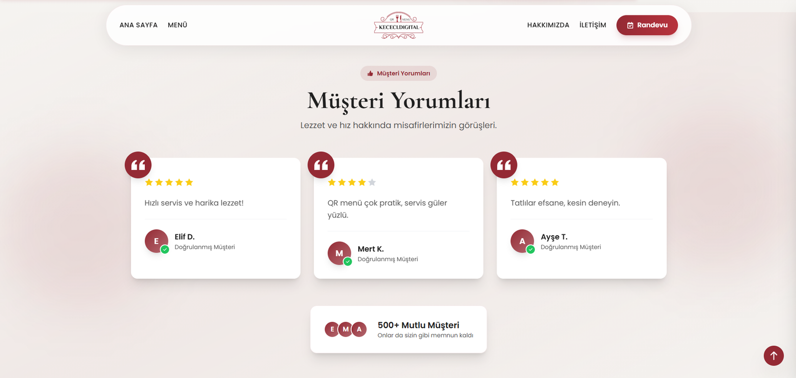 Tüm sayfalar mobil cihazlarda mükemmel çalışır. Responsive tasarım sayesinde iPhone, Android telefonlar ve tabletlerde de kullanıcı dostu arayüz sunar. QR kod okutma ile menüye anında erişim sağlanır.