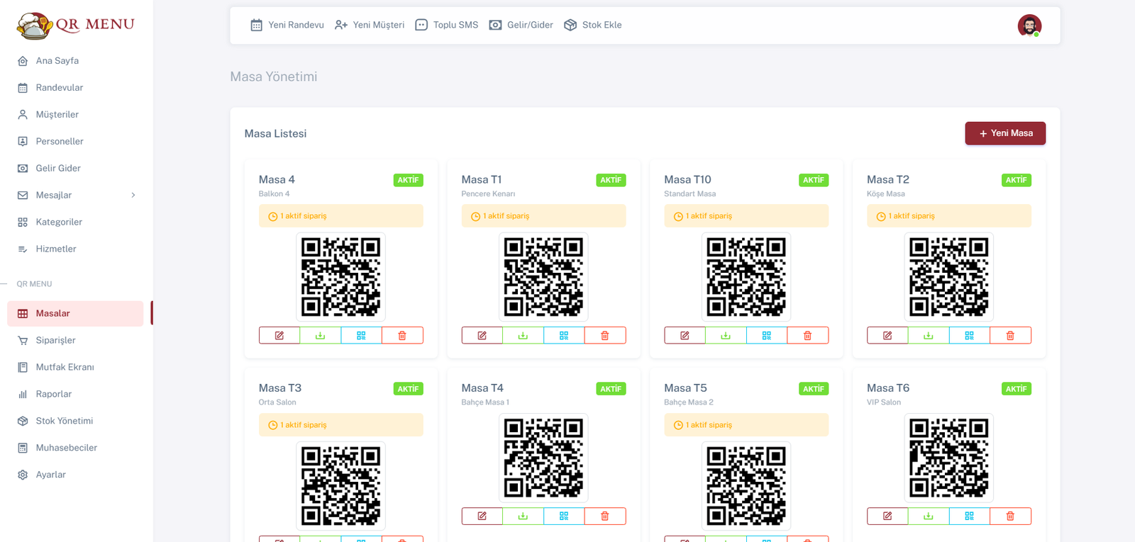 • Masa Yönetimi: Sınırsız masa ekleme, masa bazlı sipariş takibi, masa durumu yönetimi ve QR kod otomatik oluşturma.