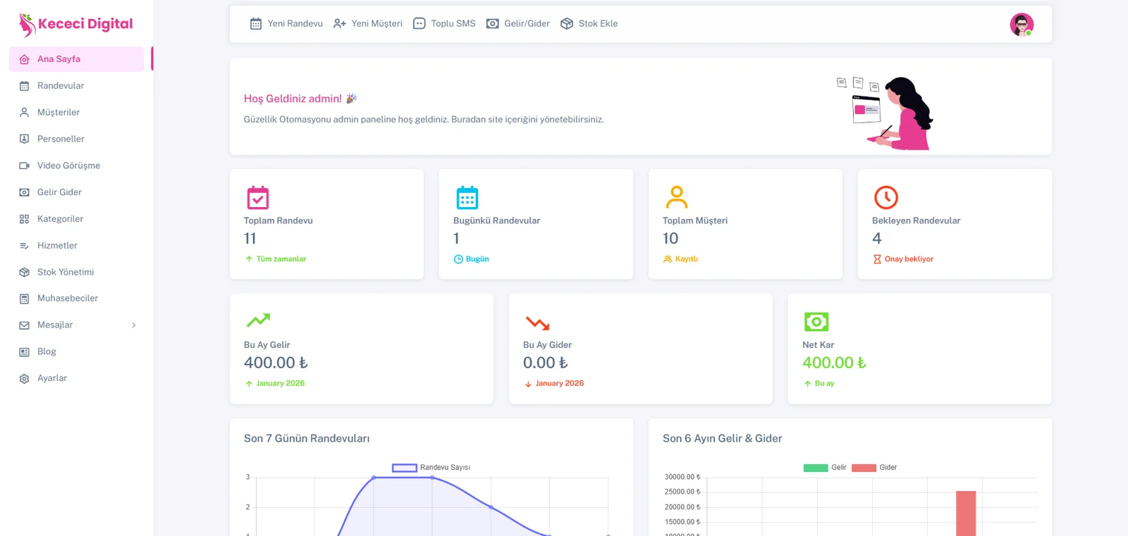 Modern güzellik salonları, kuaförler ve spa merkezleri için geliştirilmiş kapsamlı randevu yönetim ve otomasyon sistemi. Müşterilerinizden online randevu alın, personel ve hizmetlerinizi yönetin, finansal takibinizi yapın ve işletmenizi dijitalleştirin.