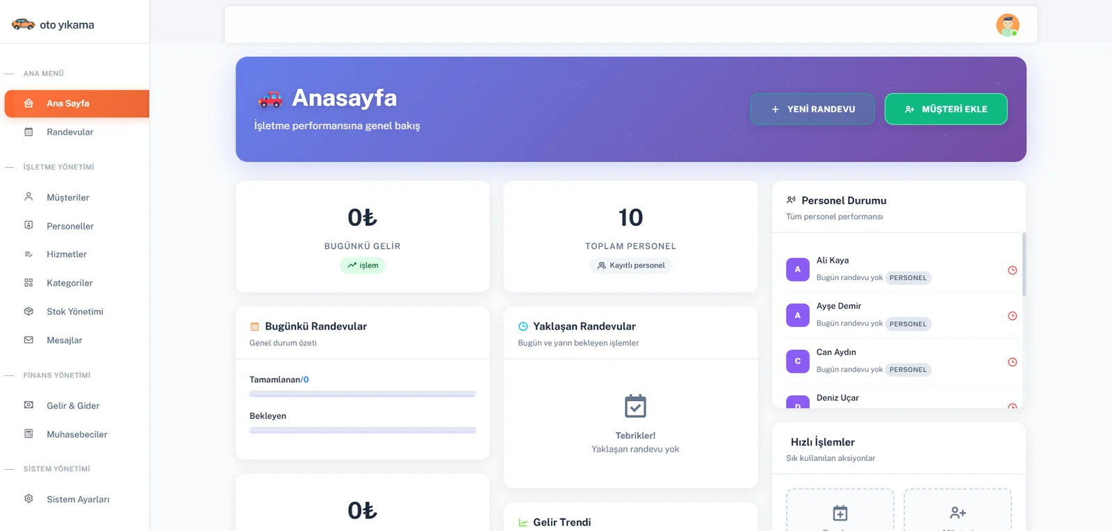Oto Yıkama Scripti, işletme düzeyinde randevu, finans ve personel yönetimini kolaylaştırmak için geliştirilmiş modern bir php takip otomasyonudur.