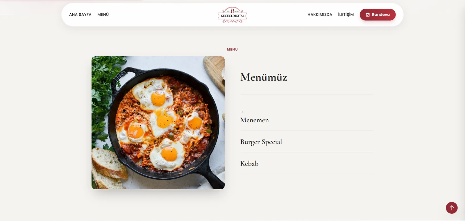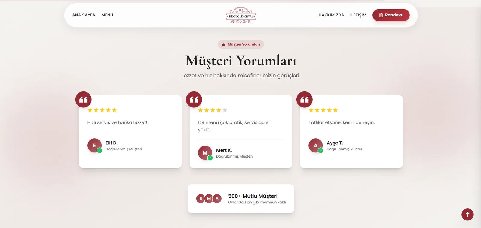 Tüm sayfalar mobil cihazlarda mükemmel çalışır. Responsive tasarım sayesinde iPhone, Android telefonlar ve tabletlerde de kullanıcı dostu arayüz sunar. QR kod okutma ile menüye anında erişim sağlanır.