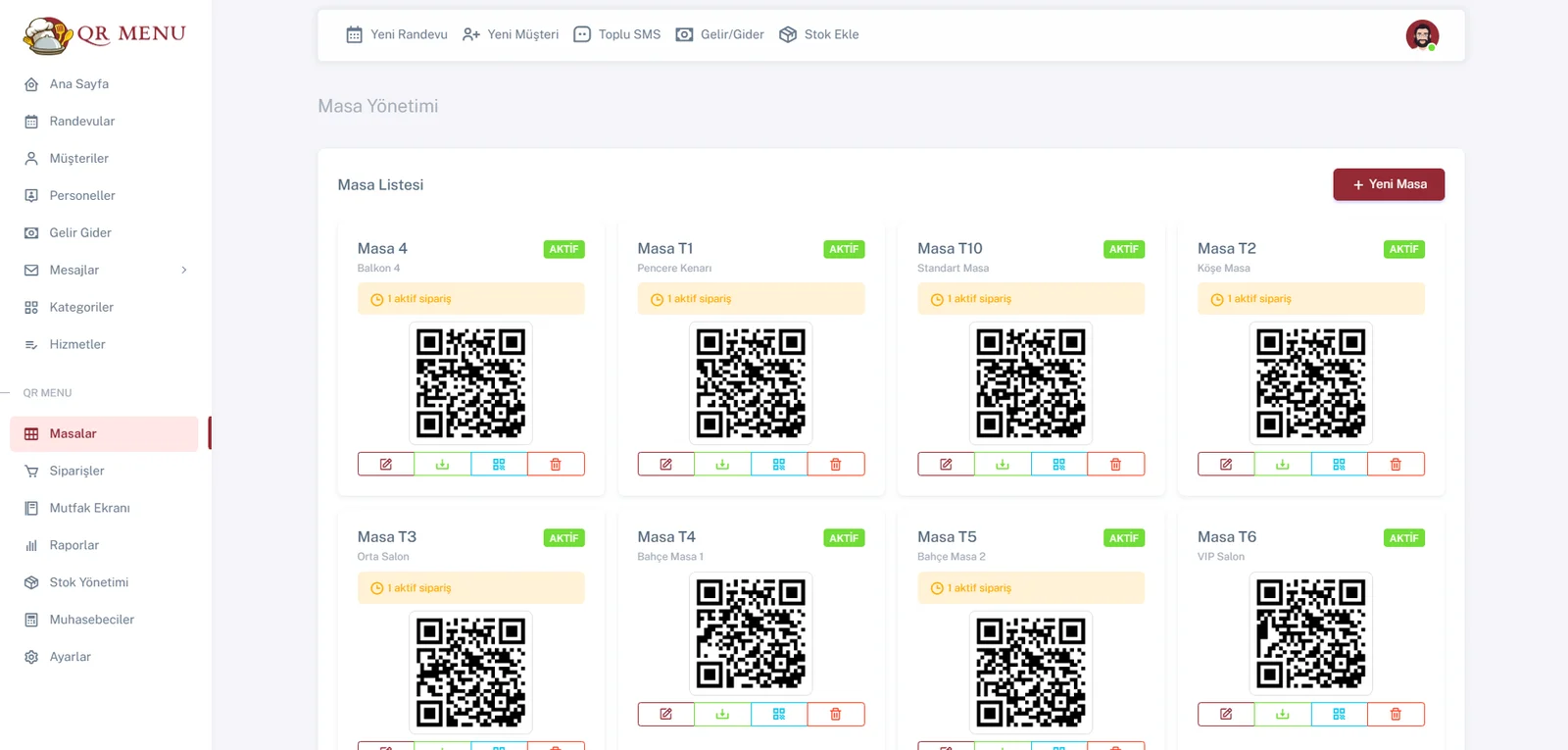- Masa Yönetimi: Sınırsız masa ekleme, masa bazlı sipariş takibi, masa durumu yönetimi ve QR kod otomatik oluşturma.