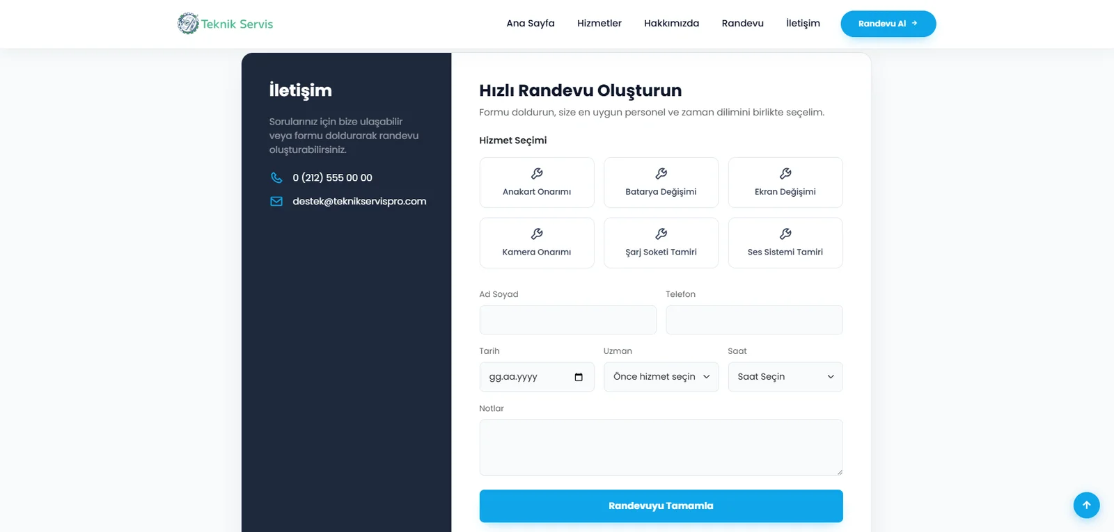 • Randevu formu – AJAX ile dinamik form, hizmet seçimi, personel ve saat seçimi