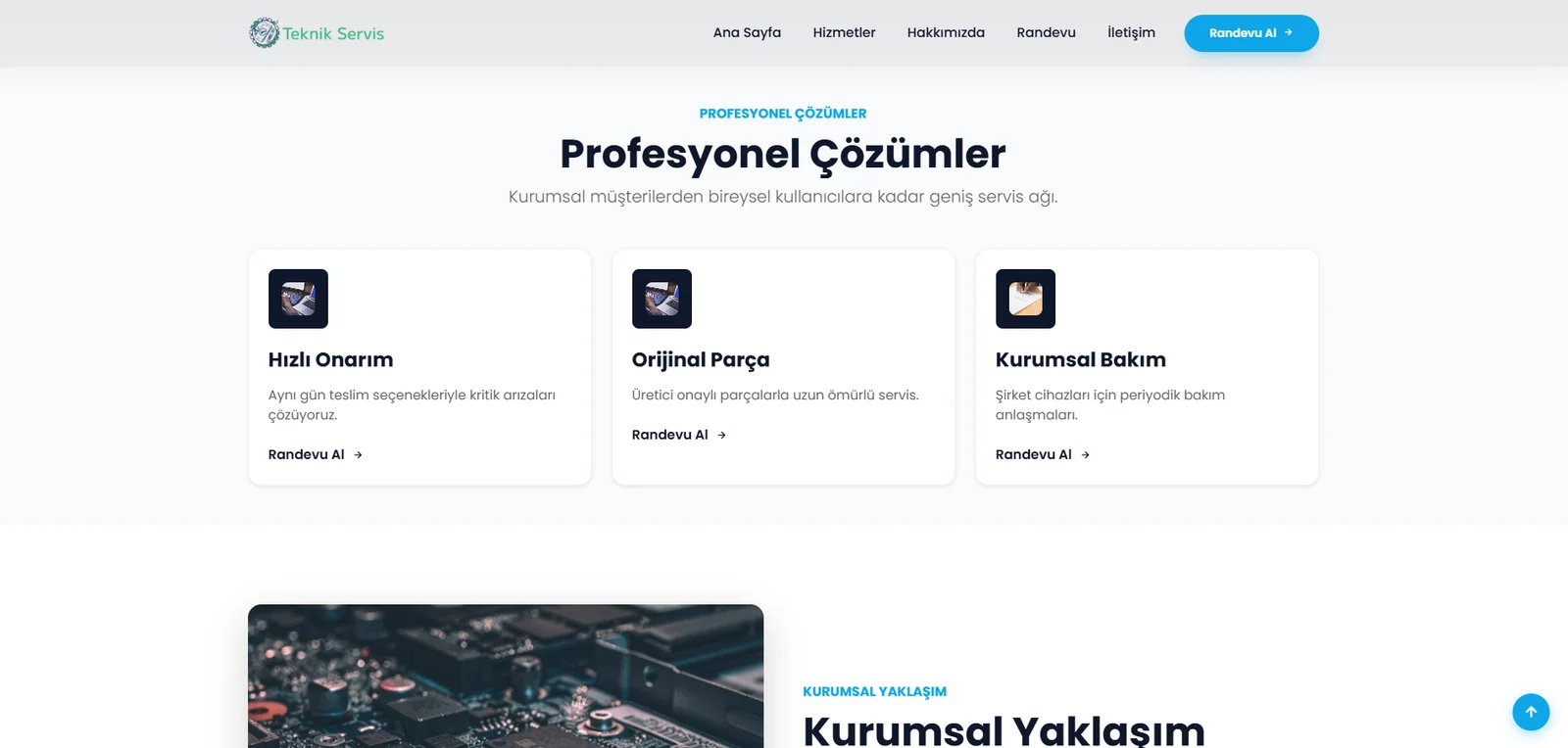 • Hizmetler bölümü – dinamik hizmet listesi, kart görünümü